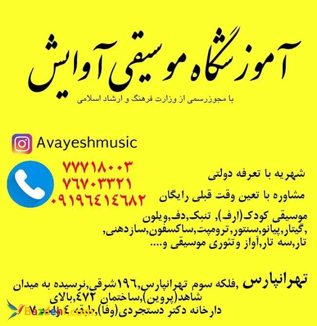 بهترین آموزشگاه موسیقی در تهرانپارس آموزشگاه موسیقی آوایش آموزشگاه موسیقی میدان پروین(شاهد) ◀️ با مجوز رسمی از وزارت فرهنگ و ارشاد اسلامی اولین مرکز تخصصی آموزشی سازهای بادی در شرق تهران ◀️شهریه با تعرفه دولتی ◀️زیر نظر برجسته ترین اساتید دانشگاهی و فارغ التحصیلان موسیقی ◀️مشاوره رایگان با تعین وقت قبلی ◀️آموزش سازهای ایرانی, سنتی, پاپ, کلاسیک و آواز آموزش موسیقی کودک(ارف) ◀️آموزش سازهای گیتار, دف, تنبک, ویولن, کمانچه, سنتور, کیبورد, پیانو, ساز دهنی, فلوت, کلارینت, ساکسیفون, ترومپت, ترمبون, تار, سه تار, نی , تنبور و سایدرام(طبل ریز) ◀️آموزش تخصصی ترومپت و سایدرام زیر نظر استاد عباس دلیری آدرس : تهرانپارس, فلکه سوم, خیابان 196 شرقی, نرسیده به میدان پروین(شاهد),ساختمان 472, بالای داروخانه دکتر دستجردی, طبقه 4 واحد 7 ☎️ 77718003- 76703321 ?09196414682- 09125705563 ? ? @avayeshmusic اینستاگرام ??? http://instagram.com/avayeshmusic
