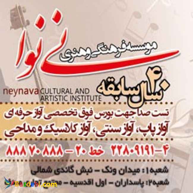 مؤسسه فرهنگی و هنری نی نوا معتبرترین و باسابقه ترین مجموعه آموزشی ساز و آواز (40سال سابقه درخشان) و معرفی استعدادهای جدید به جامعه هنری کشور مفتخریم که همواره محبوبترین و برجسته ترین هنرمندان کشور را به جامعه هنری تقدیم داشته ایم ستاره ها در یک چشم بهم زدن ساز و آواز آموختند کلینیک فوق تخصصی آواز ایران در جهان تست صدا و معرفی به صدا و سیما تست صدا جهت بورس فوق تخصصی آواز حرفه ای (آواز پاپ، آواز سنتی، آواز کلاسیک و مداحی) تولید آلبوم، کلیپ توسط برجسته ترین آهنگسازان و کارگردانان و معرفی به صدا و سیما مسابقات سراسری آواز حرفه ای کشور: مؤسسه فرهنگی و هنری نی نوا جهت تولید آلبوم های مجاز و معرفی افراد منتخب اسپانسر میشود سایر اسپانسران محترم، کارگردانان هنری سینما، فیلمسازان و تهیه کنندگان محترم صدا و سیما می توانند شخصا از بین شرکت کنندگان در مسابقات انتخاب داشته باشند برگزارکننده باشکوه ترین و بزرگترین کنسرتها، جشنواره های موسیقی در ایران و خارج از کشور اعزام محبوبترین هنرمندان و مجربترین گروه های هنری به داخل و خارج از کشور(اقصی نقاط جهان) فقط در چندماه ساز مورد علاقه خود را بیاموزید کنسرتهای هنرجویی در خانه هنرمندان نی نوا دربند شمیران اعطای گواهینامه معتبر در پایان هر دوره آموزشی ارائه کارت عضویت خانه هنرمندان نی نوا جهت استفاده هنرجویان و همراهانشان از فضاهای زیبا، دل انگیز و برنامه های هنری خانه هنرمندان نی نوا واقع در دربند شمیران 1- آموزش پیانو 2- آموزش کیبورد 3-آموزش گیتار کلاسیک 4-آموزش گیتار پاپ 5- آموزش گیتار فلامنکو 6- آموزش گیتار پاپ فلامنکو 7-آموزش گیتار راک 8- آموزش گیتار متال 9- آموزش گیتار جاز بلوز 10-آموزش گیتار الکتریک 11-آموزش گیتار بیس 12-آموزش فلوت کلیددار 13-آموزش فلوت ریکوردر 14-آموزش پرکاشن 15-آموزش تومبا 16-آموزش سازدهنی (هارمونیکا) 17-آموزش کلارینت 18-آموزش آکاردئون 19-آموزش ترومپت 20-آموزش ترومبون 21-آموزش هورن 22- آموزش ساکسیفون 23-آموزش سنتور 24-آموزش تار 25-آموزش سه تار 26-آموزش عود 27-آموزش کمانچه 28-آموزش ویلون ایرانی 29-آموزش نی 30-آموزش رباب 31-آموزش قیچک 32-آموزش قانون 33-آموزش تنبک 34-آموزش دف 35-آموزش دایره زنگی 36-آموزش قرنی 37-آموزش تنبور 38-آموزش دیوان 39- آموزش ویلون کلاسیک 40-آموزش ویلون آلتو 41- آموزش ویلون سل 42- آموزش کنترباس 43-آموزش سلفژ 44-دیکته موسیقی 45-آواز جهانی 46- هارمونی 47- فیزیک صوت 48- سازشناسی 49-ارکستراسیون 50-پارتیتورنویسی 51-مایع شناسی موسیقی ایرانی 52-ردیف های سنتی 53-تاریخ موسیقی ایران و جهان 54- فوگ وانوانسیون 55-کنتر پوئن 56- آهنگسازی