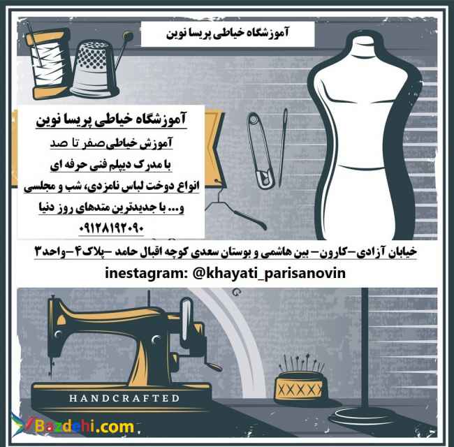 آموزشگاه خیاطی پریسا نوین آموزش خیاطی مبتدی تا پیشرفته با مدرک دیپلم فنی¬حرفه ای با امتیاز رسمی تحت وزارت تعاون، کار و رفاه اجتماعی تخصصی شب و عروس نامزدی متد گرلاوین متریک مولر مولاژ سایزبندی با بیش از 30 سال سابقه کاری انواع دوخت لباس عروس، شب و مجلسی و.... خیابان آزادی-کارون- بین هاشمی و بوستان سعدی کوچه اقبال حامد -پلاک4-واحد3 09128192090 66384312 Inestagram: khayati_parisanovin