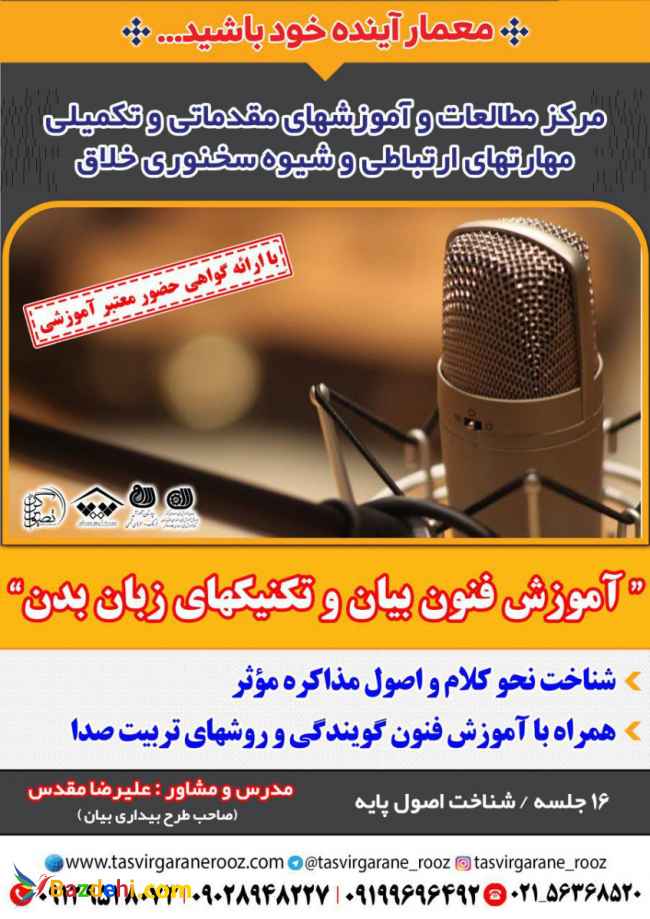 شناخت تکنیک های زبان بدن شناخت نحوکلام و اصول مذکره موثر همراه با آموزش فنون گویندگی و روشهای تربیت صدا 16جلسه /شناخت اصول پایه مدرس و مشاور : استاد علیرضا مقدس (صاحب طرح بیداری بیان ) با ارائه گواهی معتبر آموزشی جهت ثبت نام و کسب اطلاعات بیشتر با شماره ذیل درارتباط باشید : 02156368520& 09028948227