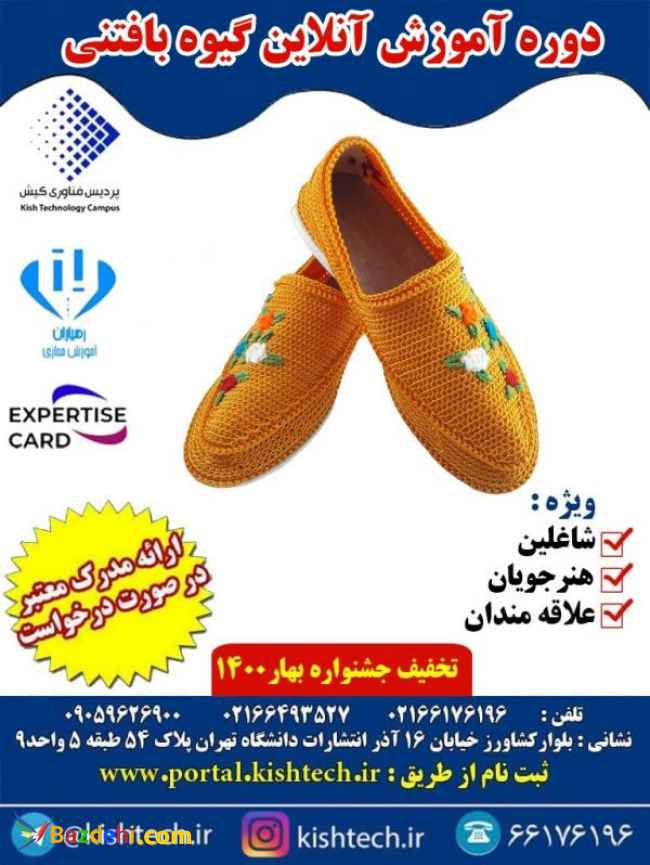 دوره آموزش آنلاین گیوه بافتنی ویژه بهار1400 دوره آموزش آنلاین گیوه بافتنی در پردیس فناوری کیش، پردیس فناوری کیش از تمام صنف های مشاغل حمایت میکند ، شما هم میتوانید کسب و کار جدیدی برای خودتان داشته باشید پردیس فناوری کیش با شماست. هدف از دوره : تربیت و آموزش افراد با هدف ایجاد کسب و کار در صنایع دستی خرید محصولات تولید شده توسط هنرجویان رایزنی برای خرید محصولات در تعداد بالا ایجاد نمایشگاه های عرضه و معرفی محصولات ارتباط با ما : تلفن : ۰۲۱۶۶۱۷۶۱۹۶ ۰۲۱۶۶۴۹۳۵۲۷ ۰۹۰۵۹۶۲۶۹۰۰ نشانی : بلوارکشاورز خیابان ۱۶ آذر انتشارات دانشگاه تهران پلاک ۵۴ طبقه۵ واحد ۹
