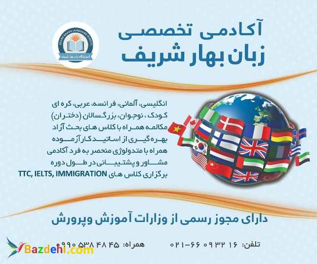 آکادمی تخصصی زبان بهار شریف با بهره گیری از بهترین مدرسان زبان در سطح استان تهران جهت آموزش زبانهای انگلیسی آلمانی فرانسه عربی و ترکی استانبولی در سه دوره کودک نوجوان بزرگسال( دختران) در خدمت شما عزیزان میباشد.