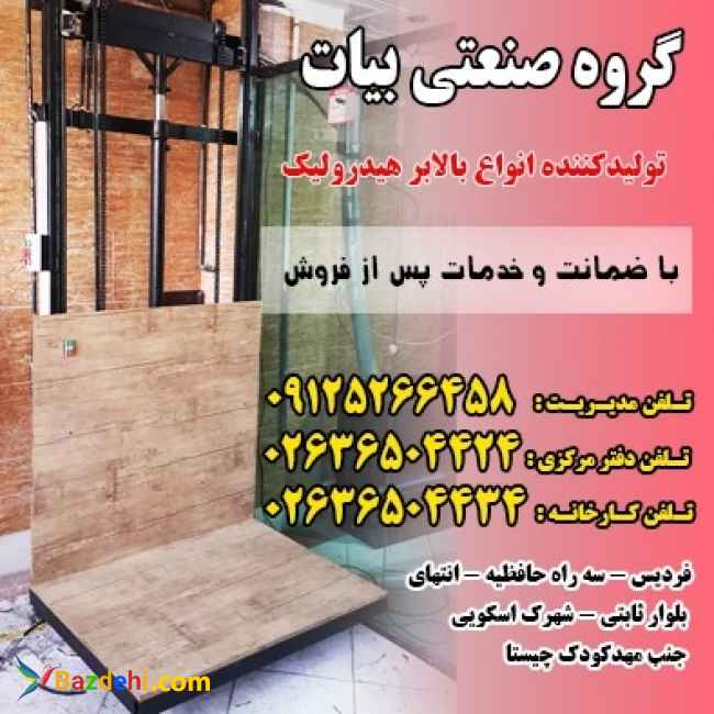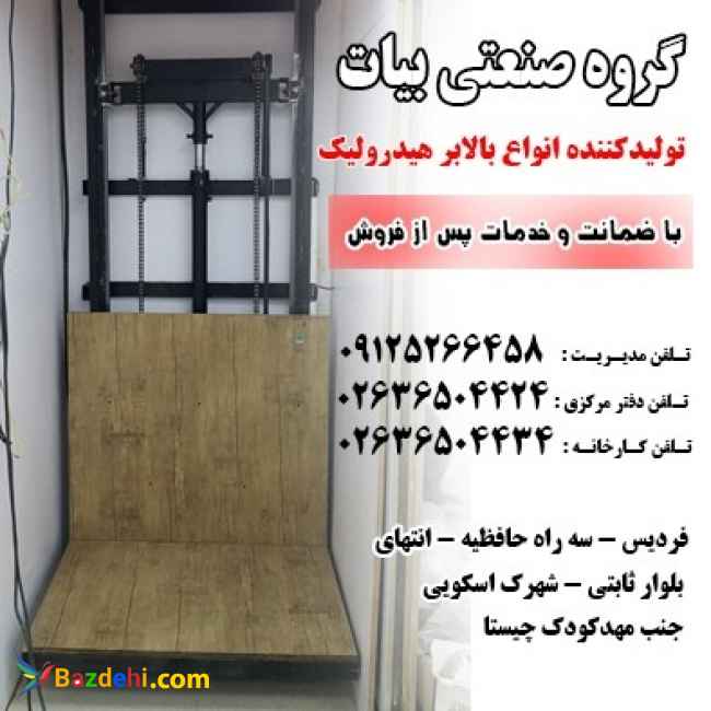 گروه صنعتی بیات طراحی،تولید و نصب بالابر هیدرولیک سبک وزن خانگی ، فروشگاهی و رستورانی مناسب حمل و جابجایی نفر ، بار و کالا و غذا بالابرهای سنگین وزن صنعتی مناسب کارگاه ها و کارخانجات در اوازن 300 تا 1500 کیلوگرم با 15 سال سابقه در سراسر ایران و کشورهای همسایه 02636504424 02636504434