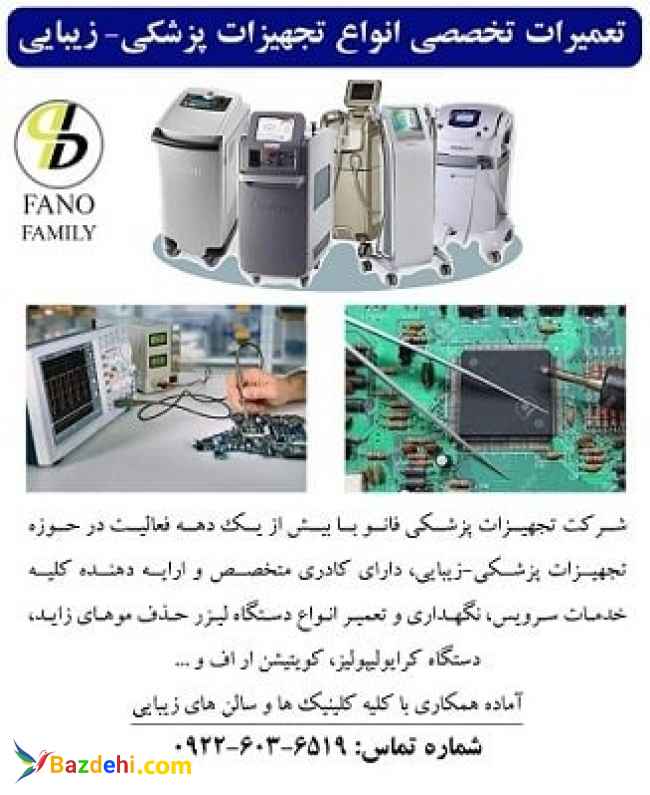 نگران نباشید، ما درستش میکنیم... شرکت تجهیزات پزشکی- زیبایی فانو با بیش از یک دهه فعالیت و پشتیبانی از چندین کلینیک مشهور کشور، دارای کادری متخصص در ضمینه سرویس، نگهداری و تعمیر انواع دستگاههای پزشکی-زیبایی شامل انواع لیزر حذف موهای زاید، کلیه دستگاههای لاغری ازجمله دستگاه کرایولیپولیز، آر.اف کویتیشن و CO2 و ... است و آماده همکاری با کلیه کلینیکها و سالنهای زیبایی میباشد. تعمیر و نگهداری از تجهیزات کلینیک و سالن زیبایی خود را به متخصصان با تجربه بسپارید. جهت مشاوره با ما تماس بگیرید: 6519-603-0922