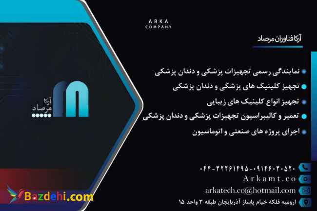 شرکت آرکا فناوران مرصاد در زمینه همکاری تجهیز و تعمیر سیستم های بیمارستانی اماکن درمانی درمانگاه ها کلینیک های تخصصی و فوق تخصصی مطب های پزشکی و زیبایی و همچنین تولید و تعمیر و نگهداری تجهیزات به روز پزشکی و همزمان ایجاد نوآوری در آنها و برگزاری دوره های آموزشی جامع تخصصی در این حوزه می پردازد. فعالیت این شرکت در قالب تیمی جوان و آینده دار پرتلاش و مجرب بوده و همواره سعی در شکستن و رفع تمامی محدودیت های داخلی و خارجی داشته است. ما فعالیت این شرکت را با یک تمرکز شروع کردیم برای ساخت یک مجموعه که زمان کار با انعطاف پذیری و تمرکز بر روی خواسته های مشتری تمامی تعهدات خود را در قبال آنها به نحو احسنت انجام دهد. تماس باما Www.Arkamt.com این آدرس ایمیل توسط spambots حفاظت می شود. برای دیدن شما نیاز به جاوا اسکریپت دارید 09146030520 04432261495