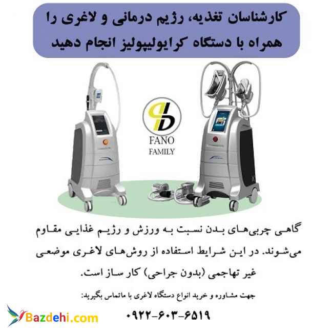 کارشناسان تغذیه، رژیم درمانی و لاغری را همراه با دستگاه کرایولیپولیز انجام دهید کرایولیپولیز روشی است که برای لاغری موضعی توسط FDA تایید شده است و بسیار بی‌خطر است که در بعضی از مراکز لاغری توسط متخصص تغذیه انجام می‌گیرد. در روش کرایولیپولیز برای از بین بردن سلول‌های چربی از دمای انجماد استفاده می‌کنند. در این روش، سرما به جز سلول‌های چربی به سلول‌های دیگر آسیب نمی‌رساند، بنابراین به پوست یا بافت زیرین پوست صدمه ای نمی‌رسد. سلول‌های یخ زده به مرور کوچک می‌شوند و طی مدت چند ماه از طریق کبد از بدن دفع می‌شوند. از آنجایی که سلولهای چربی مجددا تولید نمی شوند، می توان انتظار داشت که سایز کاهش یافته بدن و لاغری موضعی در ناحیه تحت درمان، برای همیشه برای فرد بماند. این روش به ویژه برای برآمدگی چربی در شکم فوقانی و تحتانی، نواحی پهلو (دستگیره های عشق)، بازوها و ران های داخلی و خارجی موثر است. شرکت فانو فامیلی با بیش از ده سال سابقه در زمینه واردات ، خدمات پس از فروش و همچنین تعمیرات دستگاه های کرایولیپولیز ارایه کننده انواع دستگاه کرایولیپولیز دو و تک هندپیس بکو می‌باشد. با تهیه دستگاه کرایولیپولیز از تخفیف دایمی پد کرایولیپولیز برخوردار خواهید بود. دستگاه دارای دو هندپیس کاربردی 150 و 200 میلیمتری می‌باشد. این دستگاه توانایی ایجاد سرما تا منفی 10 درجه سانتیگرداد و مکش 80 کیلو پاسکال و توان 800 وات است. دستگاه کرایولیپولیز را با یکسال گارانتی و ده سال خدمات پس از فروش تهیه کنید. جهت مشاوره و خرید انواع دستگاه لاغری و زیبایی ، انواع هندپیس کرایولیپولیز و انواع پدهای کرایولیپولیز با ما تماس بگیرید: 0922-603-6519