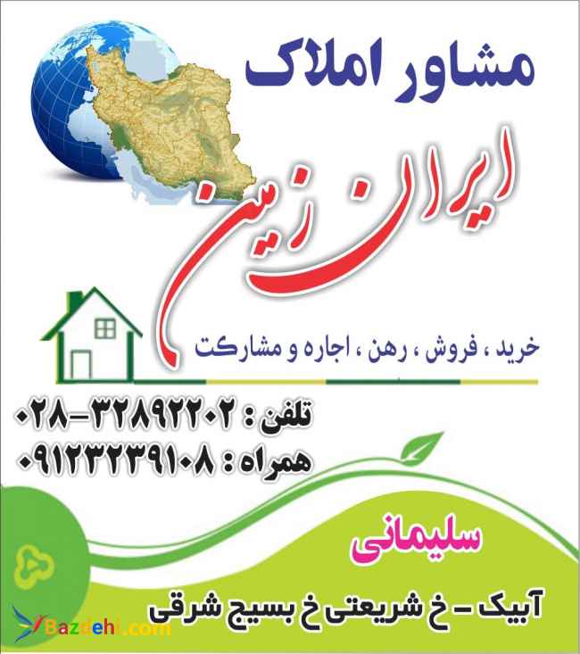 املاک آبیک ?️با بیش از بیست سال تجربه در امور ملکی?️ آدرس: آبیک خیابان شریعتی خیابان بسیج شرقی املاک ایران زمین ☎️09123239108 ☎️02832892202 مدیریت: سعید سلیمانی ارائه مشاوره در زمینه ملک و املاک ( خرید و فروش آپارتمان و کلنگی ، رهن و اجاره ، معاوضه ، مشارکت در ساخت) معرفی بهترین موقعیت های خرید یا فروش، قدم به قدم همراهی مشتریان، مشاوره دقیق و لازم، کمترین دخالت مشتری در مشکلات انجام معاملات، ارائه سودهای بسیار در معاملات و ... تماماً توسط مشاور املاک ایران زمین صورت خواهد گرفت. کافیست هم اکنون با ما تماس بگیرید.