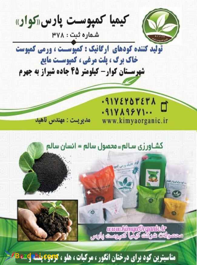 شرکت کیمیا کمپوست پارس تولید کننده و توزیع انواع کود های ارگانیک: بیو کمپوست خاکبرگ ورمی کمپوست پلت مرغی کوکوپیت کمپوست شیرین بیان پیت ماس پرلیت خاک کاکتوس خاک روف گاردن کود کمپوست مایع کود گرانول مرغی گوگرد معدنی پخش و توزیع انواع کودها و سموم کشاورزی ارایه خدمات اموزشی و مشاور ه ای، اجرا در زمینه باغبانی و کشاورزی ارسال به سرار کشور در بسته بندی و سایز بندی بصورت تناژ و خرده تماس : 09178967100 09028130505 09174253438 آدرس کارگاه : کیلومتر 45 جاده شیراز به جهرم - شهرستان کوار Www.kimyaOrganic.ir www.instagram.com/kimyacompostpars?r=nametag آدرس دفتر: جاده شیراز به جم - شهرستان کوار - بلوار آزادگان - نرسیده فلکه معلم https://chat.whatsapp.com/BgcE4b45g4h3Y7T5GJfAv6