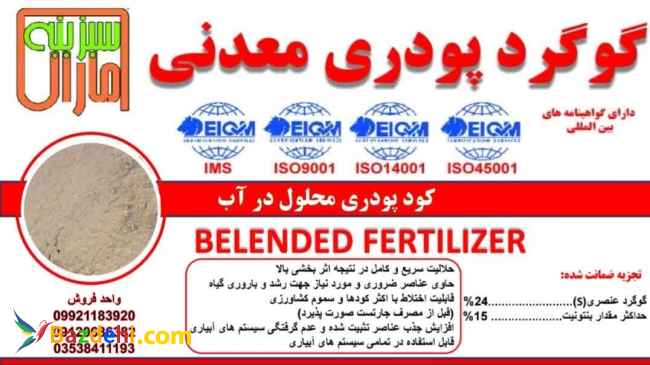کارخانجات سبزینه مارال تولید کننده انواع کودهای شیمیایی و ارگانیک گوگرد پودری معدنی ۲۴٪ دارای تاییدیه آب و خاک کشور خرید مستقیم و بدون واسطه ارسال به سراسر کشور فروش به صورت نقد و اقساط برای تمامی فروشگاه داران و کشاورزان محترم واحد فروش مستقیم کارخانه: ۰۹۱۲۰۶۸۶۳۸۲ ۰۹۹۲۱۱۸۳۹۲۰