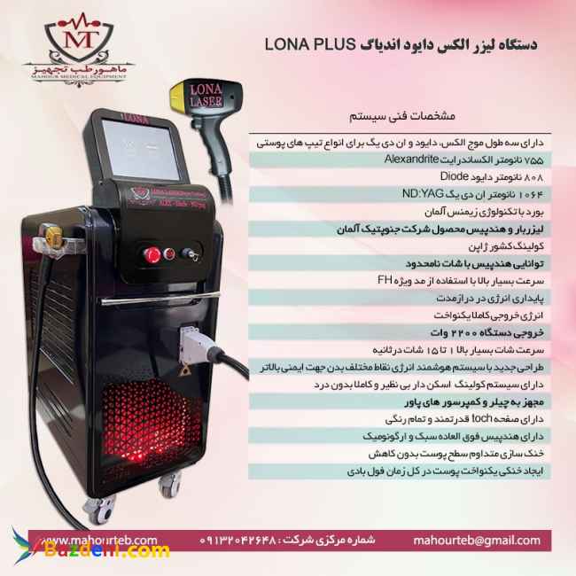 شرکت ماهور طب تولیدکننده و وارد کننده انواع دستگاه های زیبایی و لیزر، دستگاه لیزر قدرتمند لونا پلاس با سه طول موج الکس دایود اندیاگ را با بهترین قیمت در استان خراسان جنوبی و شهر بیرجند به فروش می رساند. خرید دستگاه لیزر موی زائد با کیفیت کار مشکلی است و برای این کار باید فاکتورهای متعددی را در نظر داشته باشید. دستگاه لونا لیزر که بهترین دستگاه لیزر دایود پلاتینیوم در بازار حال حاضر به شمار می آید با ویژگی های منحصر به فردی که دارد می تواند تمامی دغدغه های پزشکان محترم بیرجند را در خصوص جوابدهی لیزر موهای زائد بیماران برطرف کند. مشخصات دستگاه لیزر موی زائد لونا پلاس دستگاه لیزر لونا پلاس دارای سه طول موج الکس دایود و اندیاگ از جدیدترین تکنولوژی های روز برای حذف موهای زائد صورت و بدن استفاده می کند. این دستگاه مجهز به چیلر داخلی قدرتمند و سیستم خنک کننده بسیار قوی است که می توان با وجود این قابلیت منحصر بفرد به راحتی لیزر موهای زائد را بدون کوچکترین درد و یا عوارض خاصی انجام داد. دستگاه لیزر دایود پلاتینیوم لونا پلاس می تواند موهای زائد انواع پوست های تیره و روشن را برطرف کند و برای لیزر تمامی نقاط بدن بدون تقریبا هیچ محدودیتی قابل استفاده است. عمق نفوذپذیری این دستگاه نسبت به الکساندرایت بالاتر است. ویژگی های دستگاه لیزر دایود پلاتینیوم لونا پلاس : • مناسب برای تمامی تیپ های پوستی با انواع ضخامت مو • طول موج و انرژی بالای لیزر و قدرت نفوذ و جذب بالا در ملانین مو • عملکرد سریع، سرعت شات بالا و کاهش تعداد جلسات درمان • مجهز به چیلر داخلی قدرتمند و سیستم خنک کننده مجزا • توانایی هندپیس با شات نامحدود • لیزربار محصول شرکت جنوپتیک آلمان • یک سال گارانتی معتبر و 10 سال خدمات پس از فروش • نصب و راه اندازی و آموزش کار با دستگاه به صورت رایگان • دارای شرایط فروش به صورت نقد و اقساط بدون بهره • ارائه مدرک گواهینامه آموزشی بین المللی از مراکز معتبر علمی دستگاه رفع موی زائد پلاتینیوم لونا پلاس طول موج و انرژی بالایی دارد و در درمان موهای زائد نتایج قابل توجهی را ارائه می دهد و همین مساله مهم ترین عامل برای پزشکانی است که قصد خرید دستگاه لیزر موی زائد در بیرجند را دارند. در صورت داشتن هرگونه سوالی در زمینه خرید دستگاه لیزر موهای زائد در بیرجند می توانید پاسخ خود را از طریق تماس تلفنی با مشاوران ماهور طب دریافت نمایید. مشاور ماهور طب : 09132042648 آدرس سایت : www.mahourteb.com *** مشاوره و تجهیز فقط به صورت حضوری در محل شرکت ماهور طب انجام می شود*** توجه : شرکت ماهور طب هیچ گونه فروش اینترنتی ندارد!!!