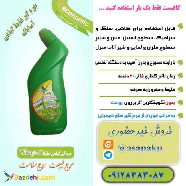 مایع ژل جرمگیر گیاهى چند منظوره پاک سیناس - آساپاک سابق- بدون ضرر براى انسان ، صرفه اقتصادى عالى- فروش غیر حضورى، عمده، جزئى
