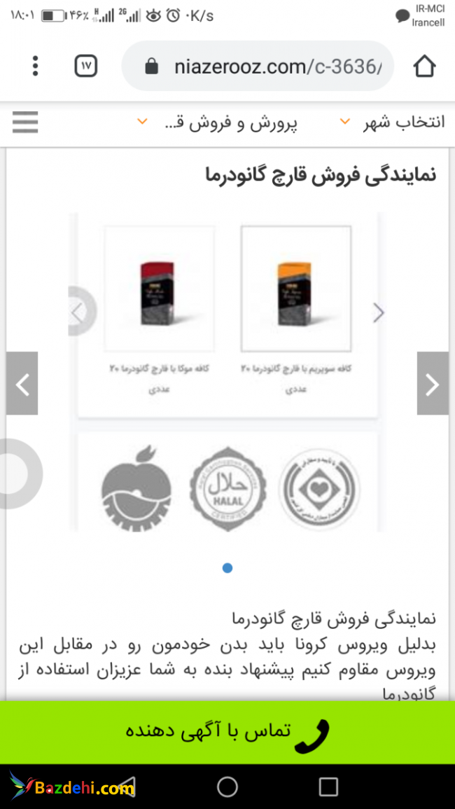 نمایندگی فروش قارچ گانودرما بدلیل ویروس کرونا باید بدن خودمون رو در مقابل این ویروس مقاوم کنیم پیشنهاد بنده به شما عزیزان استفاده از گانودرما نمایندگی گانودرما در شیراز ارسال پیامک گانودرما به شماره درج شده شما می توانید در شیراز کالا را درب منزل تحویل گرفته و توسط دستگاه کارت خوان مبلغ مورد نظر را پرداخت نمایید دارای لوگوی سلامت سیب