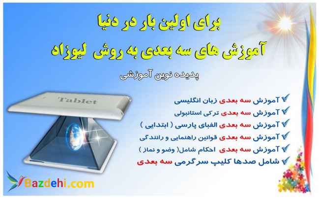 هولوگرام سه بعدی سازتصاویرگوشی وتبلت، واقعیت مجازی، بوسیله این گجت جادویی میتوانیدتصاویرگوشی وتبلت رابصورت سه بعدی ومعلق درهوامشاهده نمایید،دارای محتوای آموزشی ازجمله آموزش لغات پرکاربردروزانه زبان انگلیسی وآموزش الفبای فارسی بهمراه تصاویرومثالهای سه بعدی،جایگزین مناسب برای فلش کارتهای گران قیمت وکم بازده،ازسری محصولات یک باربرای همیشه میباشدکه توسط شرکت علم آوران(لیوزاد)برای اولین باردردنیابه تولیدانبوه رسیده ودرجهت آموزش گام برداشته شده است تاهم بعنوان طرح نودرامرآموزش ارائه شود وهم اینکه کودکان ایران زمین بیوتکنولوژی پیش روی سه بعدی دنیا آشناشده وقادربه ساخت تصاویر هولوگرافیک وارتقا وبهبوداین امرکمک نمایند.کلمه لیوزاد را دراینترنت جستجو نمایید