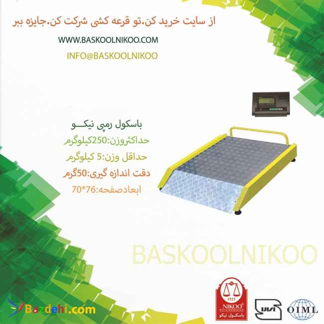 باسکول رمپی نیکو حداکثر وزن : 250 کیلوگرم حداقل وزن : 5 کیلوگرم دقت اندازه گیری : 50 گرم ابعادصفحه :76*70