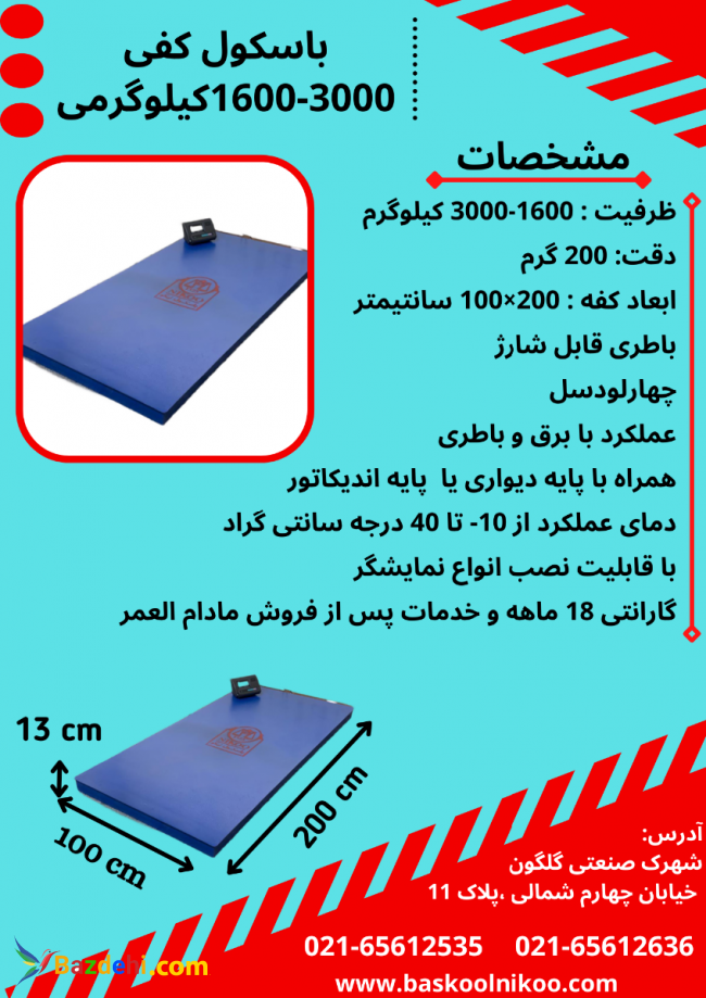 باسکول 4 لودسل الکترونیک نیکو حداکثر وزن 3000 کیلو گرم حداقل وزن 50 کیلو گرم نمایشگر Led/Lcd ابعاد صفحه 200*100 برق شهری 220 ولت /60 هرتز دمای عملکرد از -10 تا 40 درجه سانتی گراد باطری قابل شارژ