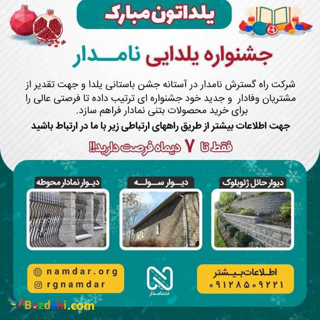 جشنواره یلدایی نامدار (بلوک های نمادار ) ⏪شرکت راه گسترش نامدار در آستانه جشن باستانی یلدا و جهت تقدیر از مشتریان وفادار و جدید خود جشنواره ای ترتیب داده تا فرصتی عالی را برای خرید محصولات بتنی نمادار فراهم سازد. ✅جهت اطلاعات بیشتر از طریق راههای ارتباطی زیر با ما در ارتباط باشید:: 021-56453840-41 0912-8509221 insta:: @rgnamdar www.namdar.org