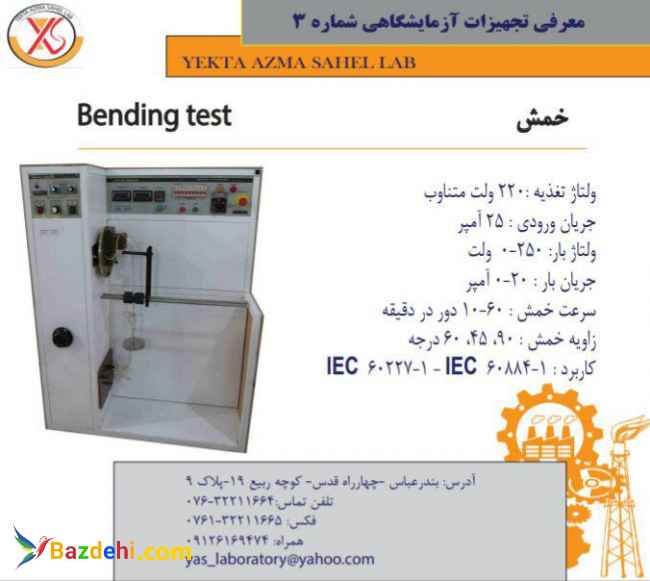 شرکت یکتا آزمای ساحل به عنوان آزمایشگاه همکار اداره استاندارد هرمزگان در زمینه ساخت تجهیزات تست و آزمایشگاهی و انجام خدمات آزمایشگاهی فعالیت می کند . نمونه دستگاه های قابل ساخت : دستگاه افزایش دما دستگاه سیم ملتهب ( گلووایر ) شعله سوزنی های ولتاژ نشت جریان تست مکانیکال خمش : ولتاژ تغذیه 220 ولت متناوب جریان ورودی : 25 آمپر جریان بار : 20-0 آمپر سرعت خمش : 60-10 دور در دقیقه زاویه خمش : 90 ، 45 ، 60 درجه کاربرد IEC 60227-1 - IEC 60884-1