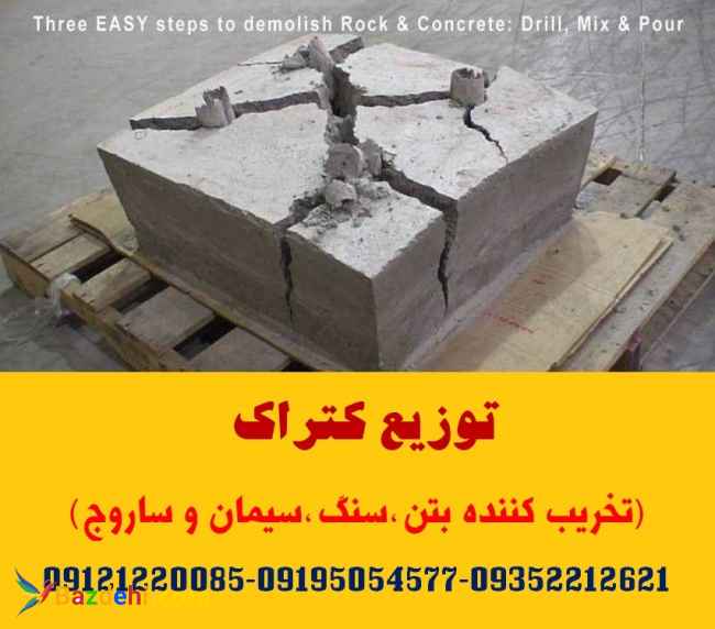 توزیع کتراک (تخریب کننده سنگ،ساروج،بتن و سیمان) کتراک یک ترکیب شیمیائی برای تخریب سنگ،بتن، ساروج و ملاتهای سنتی است. تخریب کتراک بصورتی است که هیچگونه حرارت و صدائی ایجاد نمیکند ،اما نتیجه نهایی کار مانند عملیات تخریب با انفجار است. تخریب با کتراک بسیار آسان است. این ترکیب پس از مخلوط شدن با آب با قدرت انبساطی فوق العاده باعث خرد شدن سنگ و ساروج و... میگردد. فقط کافی است محل مورد نظر را با دریل سوراخ کاری نمایید و کتراک را در آب حل کرده و در حفره ها بریزید.حاصل کار شما را شگفت زده خواهد کرد. با استفاده از کالای با کیفیت و مرغوب سرعت کار خود را افزایش داده و راندمان عملیات تخریب را به حداکثر برسانید و در هزینه ها صرفه جویی نمائید. کالا بصورت خرده فروشی و عمده فروشی ارائه میگردد.ارسال کالا در تهران بوسیله اسنپ باکس و وانت بار و به تمامی شهرستانها بوسیله پایانه های باربری و مسافربری. جهت موجودی کالا و قیمت روز با ما تماس حاصل فرمائید. 09121220085-09195054577-09352212621-09353903060 88804845-88924588