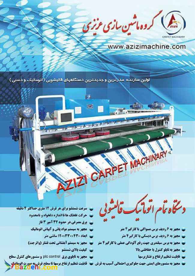 ساخت و فروش انواع دستگاه های شست و شوی فرش اتوماتیک مناسب برای شرکت های قالی شویی ،در مدل ها و قدرت های مختلف توسط شرکت ماشین سازی عزیزی با سابقه بیش از ۳۵ سال استفاده از بهترین قطعات در ساخت آن ، قیمت مناسب و کیفیت بالا از ویژه گی های این دستگاه میباشد.