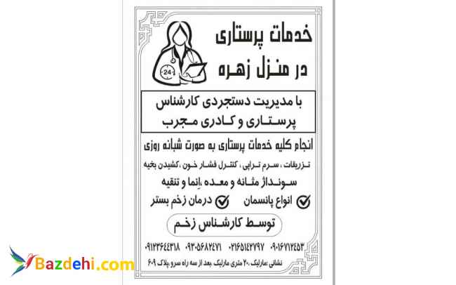 مرکز خدمات پرستاری زهره آماده ارائه خدمات پرستاری در زمینه های زیر به هموطنان عزیز میباشد سرم تراپی، سونداژ، تنقیه، کشیدن بخیه، تزریقات، زخم بستر و سایر خدمات پرستاری