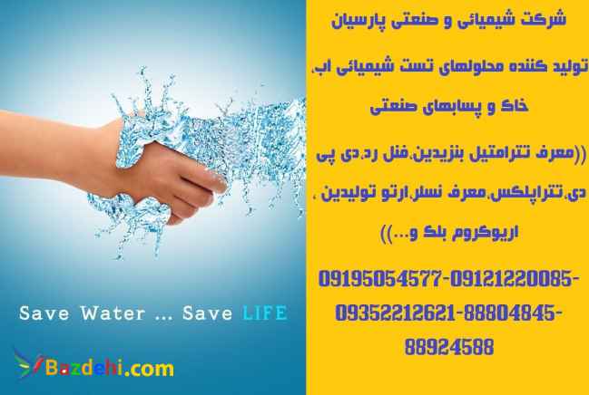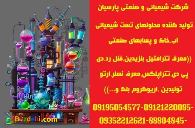 شرکت شیمیائی و صنعتی پارسیان تولید کننده: معرف تترامتیل بنزیدین(مخصوص تست کلر آزاد در آب) معرف اریو کروم بلک تی(مخصوص تست سختی کل آب) EBT محلول تتراپلکس(مخصوص تست سختی کل آب) EDTA معرف نسلر (مخصوص تست آمونیاک در آب) محلول ارتوتولیدین(مخصوص تست کلر آزاد در آب) محلول فنل رد(مخصوص تست پی اچ در آب) TRISS BUFFER PH=6.0-PH=8.0 محلول بافر تریس تولید انواع محلولهای استاندارد فلزات،آنیونها و کاتیونها با غلظت 1000mg/l شامل محلول استاندارد آلومینیوم،باریم،پالادیوم،پلاتین،نقره،روی،نیکل،کبالت،تالیم ،طلا و...ومحلول استاندارد نیترات،سولفات،کلراید،نیتریت ،سیلیکات،استات،سولفیت و... تولید انواع محلولهای (تیترازول)نرمال و 0.1 نرمال به حجم رسیده شامل محلول نرمال و 0.1 نرمال:اسید کلرئیدریک،اسید نیتریک ،اسید سولفوریک،هیدروکسید سدیم،هیدروکسید پتاسیم،تیو سولفات سدیم،نیترات نقره،کلرور قلع،کربنات سدیم،ید،پرمنگنات پتاسیم،دی کرومات پتاسیم،کرومات پتاسیم،نیترات باریم و...بصورت محلولهای به حجم رسیده یک لیتری و حداقل 18 ماه ماندگاری تولید محلولهای استاندارد کالیبراسیون کنداکتیویتی(هدایت) COD,TOCtPH BUFFERS,TURBIDITY&COLOUR تهران، خيابان استاد نجاتاللهي، انتهاي خيابان سميه، كوچه پورموسي، پلاك 17، طبقه سوم، واحد 12 تلفن: 88804845 و 8-88802917 و 9-88924588 كد پستي: 1599673135فاكس:89774845 همراه: 09195054577 و 09121220085