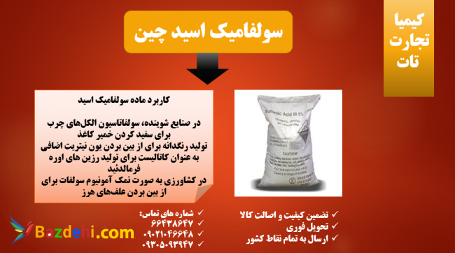 سولفامیک اسید در صنایع گوناگون کاربرد های مختلفی دارد. گستردگی کاربرد های این محصول سبب اهمیت آن در صنایع شیمیایی می شود. در ادامه به توضیح مختصری از کاربرد های فراوان این ترکیب ارزشمند می پردازیم. تولید سیلیکات سدیم ساخت و تولید بسیاری از داروهای درمانی همچون آنتی بیوتیک، نوکلئوزید، داروهای بیماری HIV، داروهای ضد صرع و کاهش وزن دترجنت اسیدی در ساخت و تولید مایع لباسشویی و ظرفشویی از بین بردن زنگ زدگی و سنگ آهک در صنایع سرامیک کاتالیزور در فرایند استری سازی در تولید رنگ و رنگدانه و پیگمنت و رزین منعقد کننده رزین های اوره – فرمالدئید تهیه سولفامات آمونیوم تولید مواد داخل کپسول های اطفای حریق آتش نشانی در صنعت خمیر و کاغذ به عنوان یک تثبیت کننده کلرید
