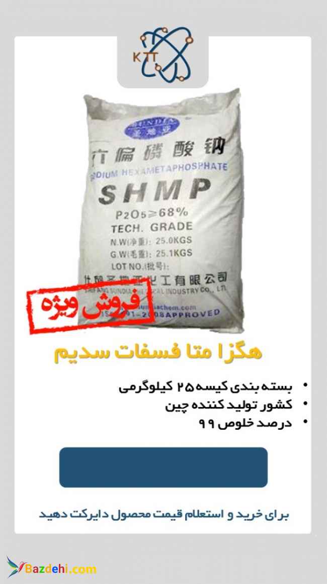 فرمول شیمیایی Na6P6O18 کشور تولید کننده چین (برند ساندیا) بسته بندی کیسه 25 کیلوگرمی درصد خلوص 99 جرم مولی 611 گرم بر مول چگالی 2.48 گرم بر سانتیمتر مکعب دمای ذوب 628 درجه سانتیگراد دمای جوش 1500 درجه سانتیگراد