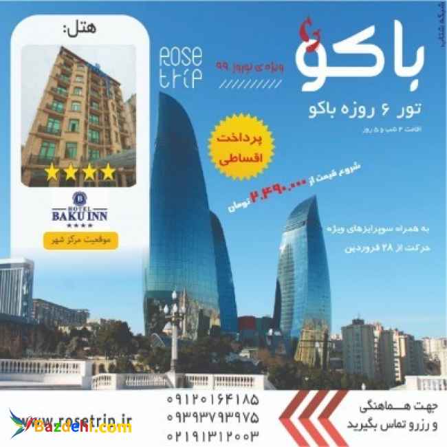 تور باکو نوروز ۹۹ ?حرکت اول:۲۸اسفند الی ۴فروردین ?حرکت دوم: ۳ فروردین الی ۸ فروردین ?حرکت سوم:۷ فروردین الی ۱۲ فروردین #تور_باکو_تور_نوروز_۹۹ ترانسفر رفت و برگشت اتوبوس vip ترانسفر مرز به مرز هتل ۴ ستاره تاپمرکز شهر صبحانه سلف سرویس ۴ شب و ۵ روز اقامت ویزای الکترونیکی ۱ روز گشت شهری با ناهار یه وعده صبحانه درمسیر رفت بیمه مسافرتی لیدر فارسی زبان از مبدا تا مقصد سفر گشت ها و برنامه های آپشنال سوپرایز های ویژه شماره های تماس: 09393793975 09120164185 91312003 021 آریان رز گشت آدرس: خیابان ولیعصر بعد از پل همت کوچه سیدالشهدا پلاک ۳ واحد ۱ تور تور باکو تور زمینی تور ارزان توز مناسب تور با قیمت مناسب تور خارجی هتل ۴ ستاره تورها تور لحظه آخری لیست تور ها تور مسافرتی آژانس مسافرتی تور هوایی تور ویژه تور باکو ویژه تور بهترین قیمت لیست تور ارزان لیست تور ارزان باکو تور هوایی تور زمینی