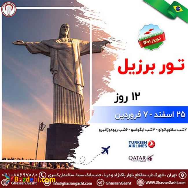 از تاریخ 25 اسفند الی 7 فروردین تعداد شب ها متغیر ( 10 تا 12 روز ) شهر های: سائوپائولو - ایگواسو - ریودوژانیرو پروازهای: ترکیش و قطر خدمات: • بلیط رفت و برگشت هواپیما • اقامت در هتل 4 و 5ستاره با صبحانه • گشت شهری با نهار • بیمه مسافرتی • ترانسفر فرودگاهی • لیدر فارسی زبان