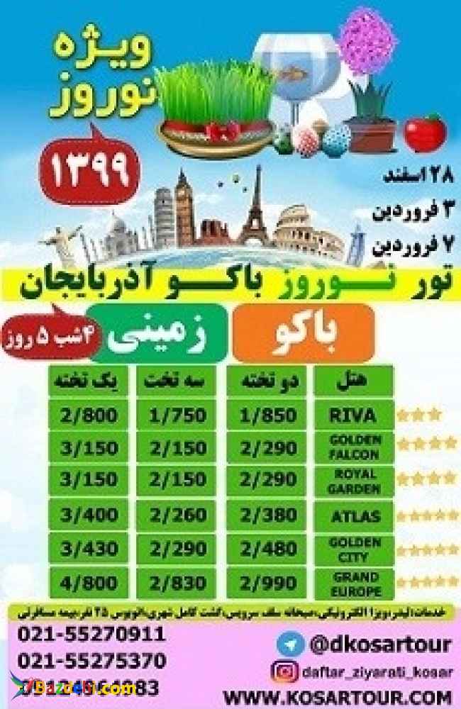 ?تور زمینی شاد زمینی باکو ویژه نوروز 99?????? ?با اتوبوس های VIP ? اقامت 4شب 5 روز ?هتل های 3/4/5 ستاره واقع در مرکز شهر ?حرکت اول 28 اسفند ویژه جشن سال نو و کنسرت ارش ?حرکت دوم 3 فروردین ویژه کنسرت سیاوش و معین ?جرکت سوم 7 فرودین ویژه کنسرت ابی و داریوش ⭕️خدمات تور : ? اقامت در بهترین هتل های باکو با صبحانه ،رفت و برگشت با اتوبوس های vip توریستی تا مرز استارا و بلعکس،ترانسفر از مرز تا باکو با اتوبوس ترک، گشت شهری بهمراه نهار رایگان و بازدید از مراکز دیدنی باکو ،ویزای توریستی ، بیمه نامه مسافرتی ، لیدر فارسی زبان ⛔️توضیحات ویژه: پرداحت 100% مبلغ تور هنگام درخواست الزامی میباشد. درصورت عدم تسویه کامل و افزایش نرخ ارز مابه التفاوت دریافت می گردد درصورت ممنوع الخروج بودن مسافر آژانس هیچ گونه مسئولیتی در این قبال ندارد ?جهت روز با شمارهای ذیل تماس حاصل نمایید ?داخلی 8 اقای رمضانی ?داخلی 3 اقای افروخته ☎️021-55275370 ☎️21-55270911 ?09124964983 ?09128509895 ? http://www.kosartour.com ✅ @dkosartour