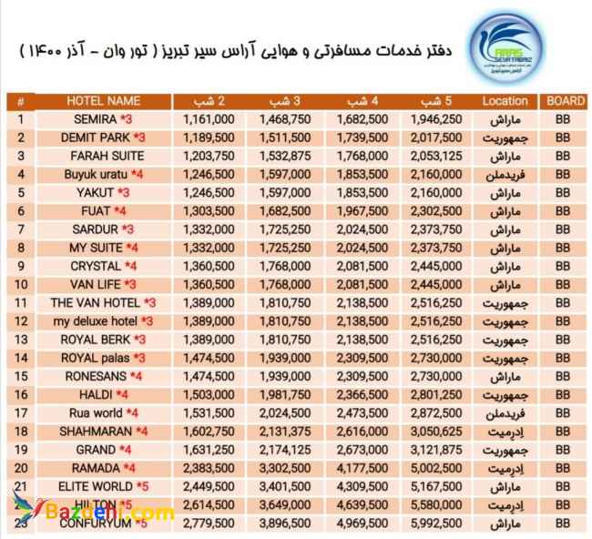 تور وان ترکیه تاریخ حرکت : همه روزه امکان رزرو تک هتل هم وجود دارد. رزرو تمامی هتل های وان در صورت تقاضای اتاق سه تخته و یا چهار تخته ، قیمت تور کاهش میابد. مدت انقضای پاسپورت حداقل شش ماه میباشد. خدمات تور شامل: ترنسفر رفت و برگشت با ون ترک ، بیمه مسافرتی ، اقامت در هتل با صبحانه و اینترنت رایگان میباشد. آدرس وبسایت: www.arasseir.com اعتماد را با ما تجربه کنید. آراس سیر تبریز مجری اصلی تورهای وان ترکیه برای اطلاعات بیشتر با شماره تلفن تماس بگیرید.