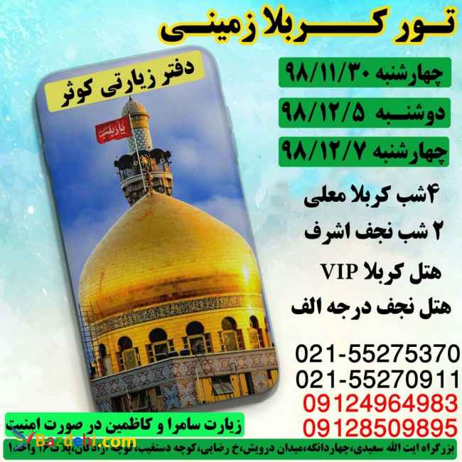 تور هوایی(7شب 8روز) دفتر زیارتی کوثر اقامتی خاطر انگیز در هتل vip در کربلا (5شب) هتل درجه الف در نجف اشرف(2شب) ترانسفر فرودگاهی گشت زیارتهای دوره صبحانه،نهار،شام همراه با سرو میوه عوارض خروج از کشور به عهده مسافر میباشد عوارض ورودی نجف به عهده مسافر میباشد استفاده از کادری مجرب در عراق همراهی مدیران و مداحان برجسته (این مجموعه کفیت را فدای کمیت نمیکند) اجرایی متفاوت و بیاد ماندنی 02155270911 02155275370. 09124964983 09128509895