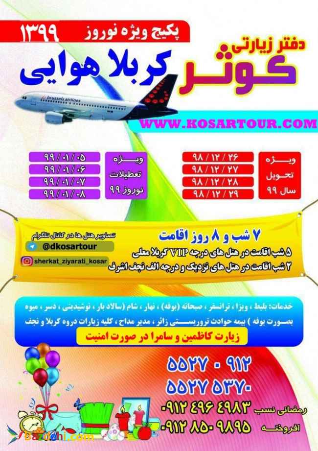 تور هوایی(7شب 8روز) دفتر زیارتی کوثر اقامتی خاطر انگیز در هتل vip در کربلا (5شب) هتل درجه الف در نجف اشرف(2شب) ترانسفر فرودگاهی گشت زیارتهای دوره صبحانه،نهار،شام همراه با سرو میوه عوارض خروج از کشور به عهده مسافر میباشد عوارض ورودی نجف به عهده مسافر میباشد استفاده از کادری مجرب در عراق همراهی مدیران و مداحان برجسته (این مجموعه کفیت را فدای کمیت نمیکند) اجرایی متفاوت و بیاد ماندنی 02155270911 02155275370. 09124964983 09128509895