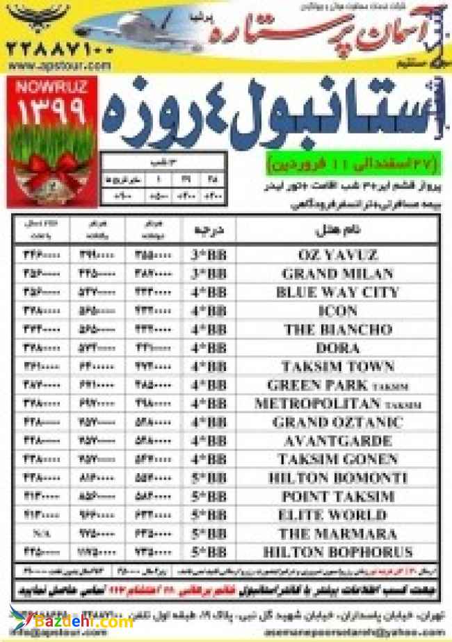 تور استانبول 4 روزه نوروز 99 یکی از چندین تور نوروزی استانبول است که میتوانید برای تعطیلات انتخاب کنید. استانبول نقطه‌ای جادویی است که در آن شرق و غرب به هم می‌پیوندند؛ شهری میان آسیا و اروپا و پر از دیدنی‌ها و خوشی‌های رنگارنگ؛ از قصرها و مسجدهای عثمانی گرفته تا کلیساهای رومی و از جنگل و جزیره و دریا گرفته تا حمام‌های تاریخی. البته همه استانبول را به مسجد ایاصوفیه و میدان تکسیم است که می شناسند. خدمات تور:(27اسفندالی 11 فروردین) پرواز قشم ایر+3 شب اقامت +تور ليدر بیمه مسافرتی+ترانسفرفرودگاهی شرایط تور : 1 – Check in ساعت 14:00 و Check out ساعت 12:00 ظهر می باشد. 2 – مسئولیت کنترل پاسپورت بعهده آژانس همکار می باشد. 3 – شرکت آسمان پر ستاره پرشیا مسئولیتی در قبال کنترل پاسپورت و هر نوع ممنوعیت خروج از کشور مسافر نخواهد داشت. 4 – در صورت جا ندادن هتلهای نام برده شده و هتل های مشابه و همردیف این هتل ها کانفرم خواهد شد. 5 – کلیه نرخها به تومان و کلیه پروازها چارتر و هتل های استانبول گارانتی بوده و غیر قابل استرداد و تغییر نام و تغییر تاریخ می باشد. 6 – به دلیل تغییرات و نوسان نرخ دلار قیمت پکیج با کانتر تور استانبول حتما چک شود. ارسال 70%کل هزینه تور استانبول 4 روزه نوروز 99 زمان رزرواسیون ضروری و در غیر اینصورت رزرو ارسالی تأیید نمی باشد. کودک زیر 2 سال : 450.000 تومان کودک 2 تا 6 سال بدون تخت : 2.900.000 تومان جهت کسب اطلاعات بیشتر با کانتر استانبول خانم برهانی 110 و احتشام 117 تماس حاصل نمایید. تور استانبول آدرس: پاسداران، گل نبی ، پلاک 19 شماره های تماس: 02122887100 02122887109 09126888665 ایمیل: این آدرس ایمیل توسط spambots حفاظت می شود. برای دیدن شما نیاز به جاوا اسکریپت دارید سایت: apstour.com کانال تلگرام: https://t.me/aseaneporsetarehpershia پیج اینستاگرام: https://www.instagram.com/asemaneporsetareh/ تور استانبول تور نوروز استانبول نوروز99 تور ترکیه نوروز 99 تور خارجی نورور99 تور آفری نوروز تور آفری استانبول تور استانبول با گشت تور استانبول 3 شب تور استانبول 4 روزه نوروز تور استانبول 3 شی نوروز تور آفری ترکیه نوروز99 تور ارزان نوروز99 تور خارجی ارزان تور نوروز استانبول آفری ویژه نوروز99 آفری ویژه استانبول تورهای نوروز 99 آژانس مسافرتی آسمان پرستاره پرشیا پرستاره پرشیا تور استانبول با پرواز چارتر تور استانبول چارتری پرواز چارتر استانبول تور با پرواز چارتر قشم ایر تور نوروزی با پرواز چارتر هتل های تکسیم هتل های ارزان تکسیم هتل 4 ستاره ارزان استانبول هتل 5 ستاره ارزان استانبول هتل سه ستاره ارزان استانبول تور استانبول با خدمات ویژه