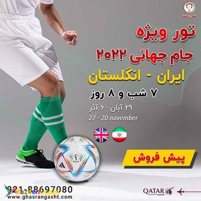تور ویژه جام جهانی 2022 تاریخ: 29 آبان - 6 آذر 20 - 27 november به مدت 7 شب و 8 روز تاریخ بازی: ایران - انگلیس : 30 آبان = 21 november بلیط رفت و برگشت هواپیمایی قطر ایرویز همراه با بلیط تماشای 3 بازی، شامل بازی های: ایران و انگلیس و 2 بازی انتخابی جهت کسب اطلاعات بیشتر با ما در تماس باشید 021-88697080 www.ghasrangasht.com
