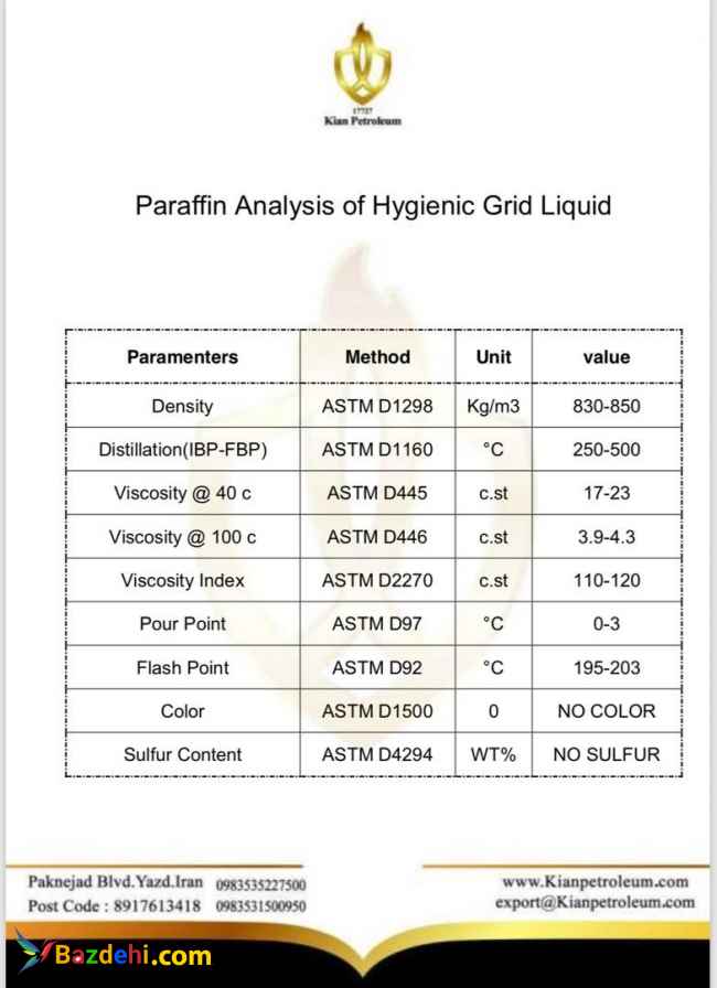 شركت كيان پتروليوم به شماره ثبت١٧٧٢٧ ، در زمينه توليد و تأمين محصولات ذيل ميتواند در خدمت مصرف كنندگان و بازرگانان گرامي باشد: * هيدروكربن سنگين * پارافين مايع رنگبري شده * کفپوش اپوکسی و کفپوش پلی اورتان * رنگ های صنعتی و ساختمانی * عایق رطوبتی بام و استخر * محافظ و جلای نمای ساختمان * انواع چسب، رزین و گروت * کاهگل مصنوعی (پلیمری) خواهشمند است جهت اطلاعات بيشتر و استعلام قيمت با شماره هاي ذيل تماس حاصل فرماييد و يا به ايميل زير درخواست خود را ارسال فرماييد. دفتر مركزي:يزد، بلوار پاكنژاد كارخانه:شهرك صنعتي يزد تلفن:٠٣٥٣٥٢٢٧٥٠٠ فكس:٠٣٥٣١٥٠٠٩٥٠ همراه:٠٩١٣٧٧٧٣١٢٣ این آدرس ایمیل توسط spambots حفاظت می شود. برای دیدن شما نیاز به جاوا اسکریپت دارید www.kianpetroleum.com از اينكه از سايت ما بازديد نموديد سپاسگزاريم.