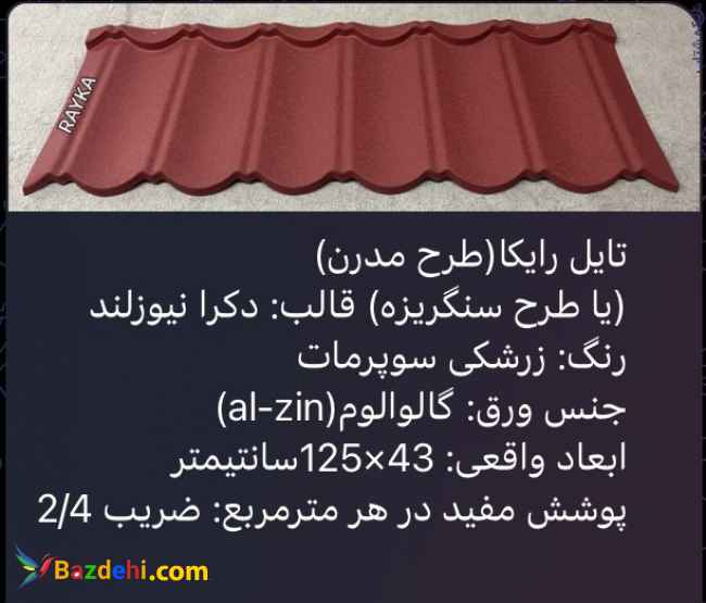 کارخانه تولیدی رایکابام مفتخر است با همکاری مهندسان و متخصصان داخلی و خارجی ، گامهای مهمی در خصوص تولید و عرضه کلیه متریالهای سقفهای شیبدار با مواد اولیه درجه یک و به روز دنیا و تولید محصولات متنوع و با کیفیت بردارد، که کاملا قابل رقابت با محصولات درجه یک وارداتی میباشد،که برای استفاده در تمام مناطق آب وهوایی کشور میسر میباشد، قبل از اجرای سقف شیبدار خود، با ما در ارتباط باشید تا از مشاوره ی رایگان ,متخصصان بهره مند شوید. کارخانه: شهرک صنعتی شمس آباد 09124778367 - فکس : 02156234631 02156234627 www.raykabam.com www.instagram.com/raykabam www.raykabam.ir این آدرس ایمیل توسط spambots حفاظت می شود. برای دیدن شما نیاز به جاوا اسکریپت دارید داود حقیقت تهران > تهران لیست محصولات گروه تولیدی رایکابام: تولید و پخش تایل رایکا مدرن سوپرمات (طرح سنگریزه)، درطرحهای: طرح دکرا، طرح شینگل، طرح آندوویلا تولید و پخش تایل رایکا کلاسیک سوپرمات، درطرحهای: طرح دکرا، طرح شینگل، طرح آندوویلا تولید و پخش تایل رایکا ساده براق، درطرحهای: طرح دکرا، طرح شینگل، طرح آندوویلا تولید و پخش تایل رایکا متالیک سوپرمات، درطرحهای: طرح دکرا، طرح شینگل، طرح آندوویلا تولید و پخش قاب نمای هلالی و پله ای در طرحهای مختلف جهت دور سقفهای شیبدار، تولید و پخش لمبه یا دامپا فلزی(رنگی، خام و گالوانیزه)،،آبرو جعبه ای گالوانیزه، سایدفلاشینگ و باکس فروش تایل سنگریزه دار دکرا، تایل تویو و تایل کینگستون و شینگل فروش لمبه چوبی روسی و چوب چهارتراش روسی فروش و برشکاری ورق طرح سفال ، ورق ذوزنقه، ورق شادولاین، ورق سینوسی، ورق جنوا (گالوانیزه و رنگی) تایلهای رایکا طرح دکرا و طرح آندوویلا سیستم پیشرفته پوشش سقفهای شیبدار میباشد که با بهره گیری از مدرن ترین فناوری ها و تکنولوژی پیشرفته در کشورمان تولید میشود و رقیب تایلهای وارداتی بوده و با استفاده از مرغوب ترین متریال، در حال نوآوری و توسعه پوشش سقفهای شیبدار، در جهت افزایش ارزش املاک مشتریان خود است. فلز مصرفی در تولید تایلهای رایکا،آلوزینک یا گالوالوم میباشد،که با ترکیبی از فلز آلومینیوم و فلز روی،(al_zin) پوشيده شده است، کلیه تایلهای رایکا، دارای پنج سال گارانتی میباشد و رزین انتخاب شده در رنگهای تایل رایکا بر پایه پلی اورتان میباشد که باعث شده تا در معرض تابش مستقیم نور خورشید ، رطوبت بالا و سرمای شدید، ثبات رنگ خود را به خوبی حفظ نماید. تایلهای رایکا بدلیل فرم دهی عالی ، همپوشانی و چیدمان یکنواخت در سقف، عملا نفوذ آب را غیرممکن می سازد. زیبایی ، دوام و کیفیت بالای محصولات رایکابام بهترین تبلیغ برای ماست. اجرای نما لمبه اجرای نما لمبه فلزی ارزانترین سقف شیروانی اموزش نصب لمبه فلزی اندوویلا شمس آباد انواع پوشش سقف شیبدار انواع پوشش سقف شیبدار فلزی انواع سقف شیبدار انواع سقف شیروانی مدرن انواع سقف ویلا در شمال آندوویلا قیمت پوشش زیر سقف شیروانی پوشش سقف آندولین پوشش سقف شیبدار مدرن تایل دکرا تایل طرح دکرا تایل سقف شیروانی تولید کننده سقف شیروانی خرید لمبه چوبی رنگ چوب لمبه رنگ سقف شیروانی سایز قوطی سقف شیروانی سقف سفالی آلاچیق سقف سفالی ویلا سقف سنگریزه ای رایکا سقف سنگریزه ای کینگستون سقف شیروانی ارزان قیمت سقف شیروانی مدرن سقف رایکا چیست سقف کینگستون چیست سقف رایکا در شمس آباد تهران سقف کینگستون در شمس آباد تهران سقف ویلا مدرن شرکت رایکا شرکت کینگستون شیروانی طرح سفال قهوه ای سوخته طراحی سقف شیبدار طراحی سقف شیبدار ویلا فروش لمبه چوبی تهران قیمت انواع پوشش سقف شیبدار قیمت ایرانیت فلزی ۶ متری قیمت آندوویلا دیجی کالا قیمت تایل سنگریزه ای قیمت سقف سفالی قیمت سقف رایکا قیمت سقف کینگستون قیمت لمبه چوبی سقف قیمت نصب آندوویلا قیمت نصب رایکا قیمت نما شیروانی قیمت نما و لمبه قیمت هر متر مربع سقف رایکا قیمت هر متر مربع آندوویلا قیمت هر متر مربع سقف کینگستون قیمت هر ورق آندوویلا قیمت هر ورق رایکا قیمت ورق پیشانی قیمت ورق تایل قیمت