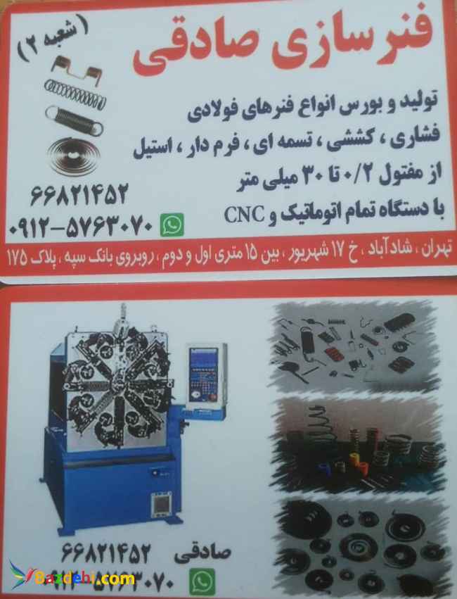 فنر سازی صادقی سالها تجربه و دقت در تولید محصولات فنری سبب شده است از نظر کیفیت در قله های کیفی باشد و با جلب اعتماد مشتریان توانسته خدمات خود را گسترده تر کرده و در حوزهی تولید انواع فنرهای کششی، تسمهای، فشاری یکی از پیشگامان و اولین تولیدکنندگان انواع فنرهای صنعتی در ایران میباشد که با سابقهای درخشان از دیگر رقبای خود پیشی گرفته است و به نامی آشنا در عرصهی فنرسازی تبدیل شده است. فنرسازی صادقی،تولید و بورس انواع فنر از مفتول ۰/۲ تا ۳۰ میلی متر با دستگاه تمام اتوماتیک و CNC تولید وبورس انواع فنرهای فولادی فشاری تولید و بورس فنرهای کششی تولید و بورس فنرهای تسمه ای تولید و بورس فنرهای فرم دار تولید و بورس فنرهای استیل سازنده انواع فنرهای فولادی و تسمه ای خرید و فروش انواع مفتول های فنری، استیل و تسمه ای تولید انواع فنر با دستگاه cnc فروش انواع فنرهای فولادی فروش فنرهای تسمه ای و فرم دار فروش فنرهای کششی و استیل تولید و فروش فنرهای فولادی تولید و فروش فنرهای کششی تولید و فروش فنرهای تسمه ای عرضه کننده انواع فنرهای فولادی با cnc فنرسازی محدوده شاداباد فروش فنر در شاداباد بورس فنر فنرسازی مهدی صادقی تلفن 09125763070 تلفن 66821452 موبایل 09125763070-0902451943