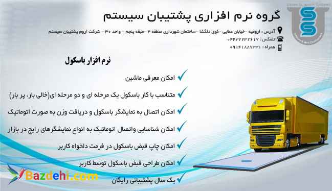 نرم افزار باسکول پشتیبان سیستم این نرم افزار برای باسکول های عمومی و جاده ای طراحی شده است . هدف از تولید این نرم افزار سرعت بخشیدن و آسان نمودن عملیات توزین توسط کاربر می باشد . .1 معرفی ماشین و تجهیزات با امکان تعیین مشخصات آن ) نوع ماشین , خالی بار , ...( .2 امکان توزین یک مرحله ای و 2 مرحله ای و متفرقه و چاپ برگه باسکول آن .3 امکان تعریف کرایه حمل , هزینه باسکول , هزینه بارگیری برای هر توزین .4 امکان توزین دستی ) بدون اتصال به نمایشگر باسکول ( .5 امکان تهیه گزارشات توزین به صورت روزانه , ماهانه , سالانه .6 امکان تهیه لیست توزین های یک ماشین و یا یک کالا .7 امکان تعریف درصدهای ارزش افزوده و اعمال آن در رسید های توزین .8 امکان اتصال به انواع نمایشگر های باسکول رایج در بازار و تنظیم آن توسط خود کاربر .9 امکان تعریف کاربر در سیستم و تعیین سطح دسترسی برای هر کدام .10 امکان تهیه گزارش از میزان کارکرد صندوق برای هر روز .11 امکان طراحی گزارشات و برگه های باسکول توسط خود کاربر