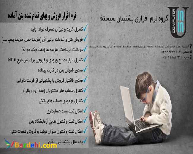 این نرم افزار مخصوص کارخانجات تولید بتن آماده طراحی و تولید شده است. عملیات خرید مصالح، فروش بتن، خدمات، انبار مصالح، انبار