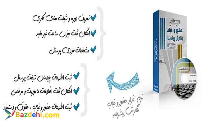 قابلیت ثبت آیتم های گوناگون در الگوی حضور و غیاب ( مدت زمان اضافه کار ، مدت زمان تاخیر و تعجیل ، حداکثر مدت زمان اضافه کار روزانه و ... )