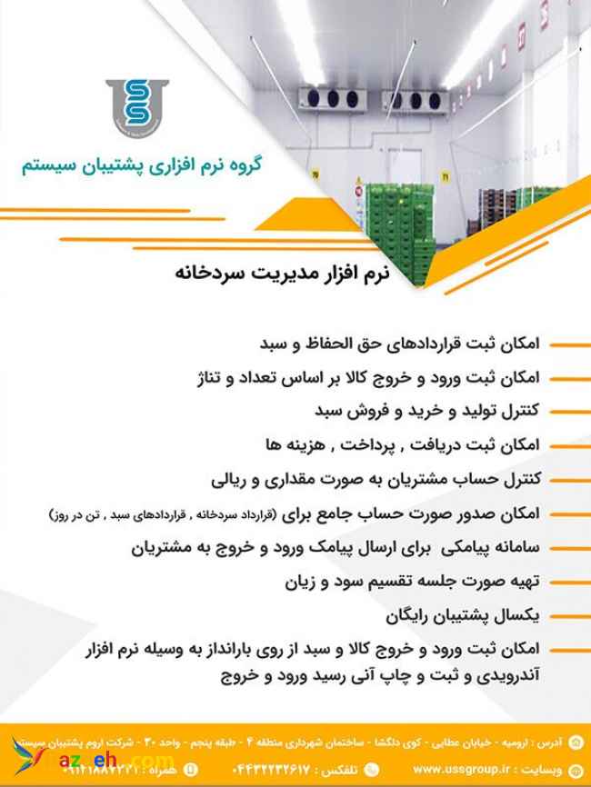 نرم افزار مدیریت سردخانه برای کنترل ورود و خروج کاال، قرارداد های حق الحفاظ و سبد، کنترل تراکنش های مالی، کنترل تولید، خرید و فروش سبد و مدیریت هزینه ها تولید شده است. امکانات نرم افزار  امکان ثبت قرارداد های حق الحفاظ و قرارداد سبد مشتریان  امکان ثبت ورود و خروج کاال به دو صورت دستی و باسکول  امکان اتصال نرم افزار به انواع نمایشگرهای باسکول رایج در بازار  امکان ثبت تولید، خرید، فروش سبد و کنترل موجودی ریالی و مقداری آن  امکان کنترل حساب ریالی و مقداری مشتریان به تفکیک قرارداد  امکان ثبت دریافت و پرداخت و هزینه ها) نقد، چک، حواله(  امکان ثبت صورتحساب برای قراردادها  امکان محاسبه تن در روز به صورت اتوماتیک  امکان گزارش گیری از حساب مشتریان ) ریالی و مقداری (  امکان گزارش گیری از سبد تولیدی، خریداری شده و فروش رفته  امکان تعریف کاربر و معرفی سطوح دسترسی  ارسال پیامک به صاحب بار  سال اول کاری ارائه خدمات پشتیبانی رایگان میباشد امکانی جدید و انحصاری در نرم افزار مدیریت سردخانه پشتیبان سیستم  امکان ثبت ورود و خروج با استفاده از تبلت از روی بارانداز و ذخیره اتوماتیک در کامپیوتر سرور بدون نیاز به اینترنت با استفاده از نسخه موبایل نرم افزار  ارسال همزمان پیامک به صاحب بار و چاپ رسید ورود و خروج در کمتر از 5 ثانیه همزمان با ذخیره و ارسال پیامک