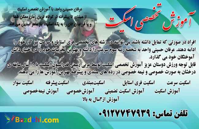 ثبت قرارداد با سایر شرکتها آموزش اسکیت از3سال به بالا بدون محدودیت سنی آموزش اسکیت از مبتدی تا حرفهای آموزش رشتههای سرعت و فریاستایل کلاسهای نیمهخصوصی کلاسهای خصوصی هرترم10جلسهی یک ساعته میباشد با10سال سابقهی درخشان