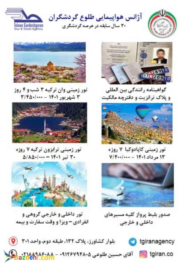 آژانس طلوع گردشگران،تورهای داخلی و خارجی و صدور بلیط شماره همراه: 09365977757 تلفن ثابت: 02188986088 02188979769 02188979770 02188979771 آدرس سایت http://tgiran.ir/fa آدرس اینستاگرام https://instagram.com/tgiran.co کانال تلگرام https://t.me/tgiranagency آدرس: تهران، بلوار کشاورز، جنب هتل اسپیناس، ساختمان صدف پلاک 132 طبقه دوم واحد 301 آژانس طلوع گردشگران با حدود 30 سال سابقه در حوزه گردشگری مجری مستقیم تورهای داخلی و خارجی به صورت گروهی و انفرادی صدور گواهینامه بین المللی در 15 دقیقه صدور بلیط کلیه مسیرهای پروازی داخلی و خارجی رزرو وقت سفارت ، اخذ و پیکاپ ویزا صدور بیمه نامه مسافرتی انواع بیمه مسافرتی آغاز تورهای خارجی بلیط اتوبوس بلیط قطار بلیط هواپیما بهترین بیمه مسافرتی بهترین مجری تورهای داخلی بیمه مسافرتی بیمه مسافرتی با پوشش کرونا پکیج تورهای خارجی تورهای خارجی تورهای خارجی گشت تورهای خارجی بازنشستگان تورهای داخلی ارزان قیمت تورهای داخلی تورهای داخلی مجردی تورهای مسافرتی خارجی ارزان قیمت تورهای مسافرتی داخلی با اتوبوس خرید بلیط هواپیما ارزان تورهای داخلی صدور بلیط قطار قیمت بلیط هواپیما قیمت تورهای خارجی کانال تورهای خارجی کانال تورهای داخلی ایران لیست تورهای داخلی نحوه صدور بلیط هواپیما